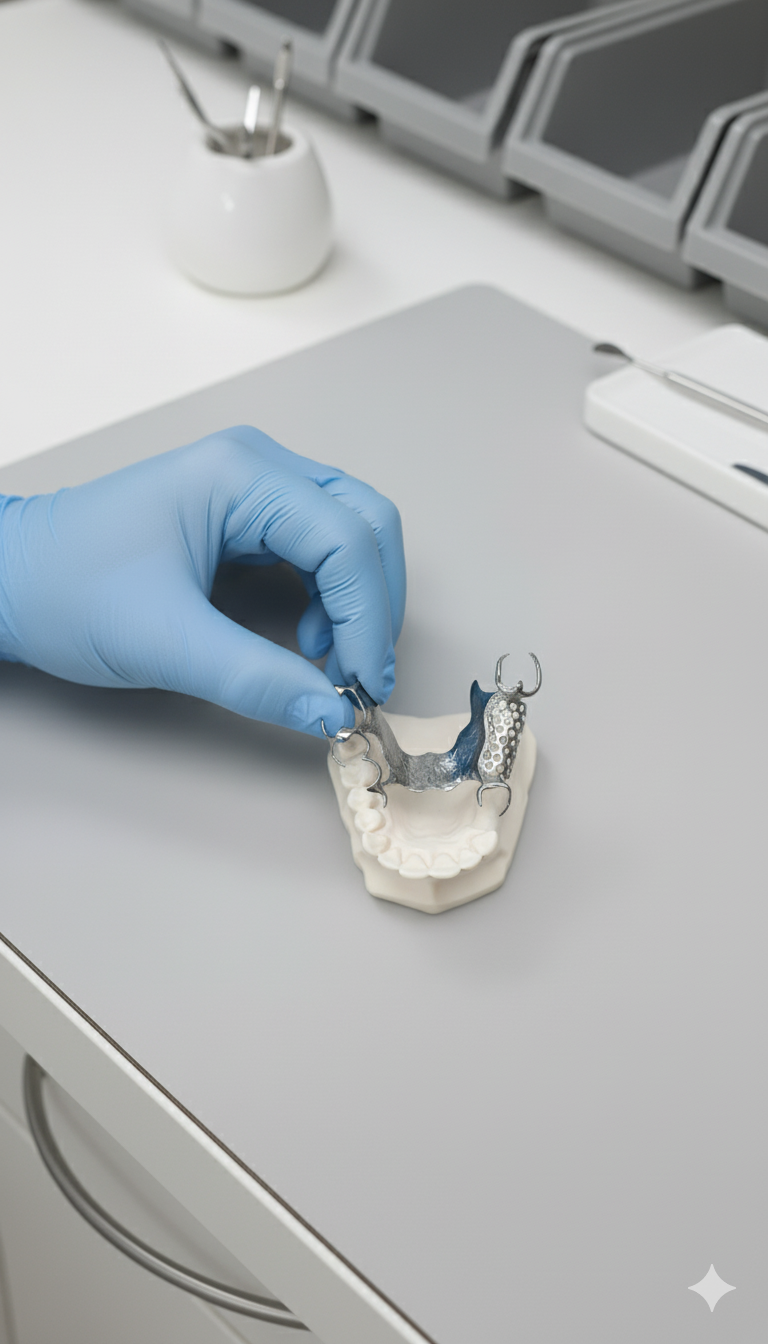 Vous concevez la prothèse (CAO). Dent All Group produit le châssis et le modèle 3D, descend le châssis sur le modèle, contrôle l’ajustage et vous livre – aux mêmes délais qu’un châssis simple, sans surcoût.
